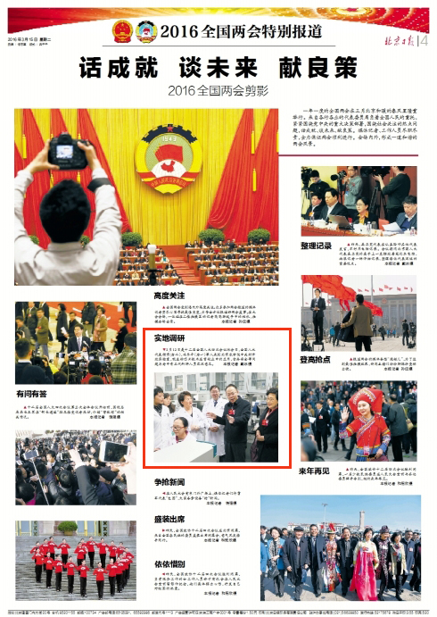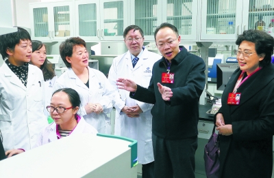 3月12日是十二届全国人大四次会议休会日,全国人大代表程京(右二)、冯乐平(右一)等人来到北京农学院中关村开放实验室,就生物芯片技术在畜牧业中的应用、食品安全等问题与老中青三代科研人员交流意见。 本报记者 戴冰摄