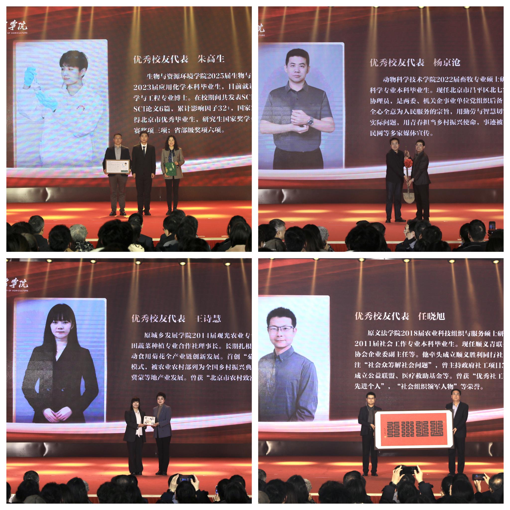 优秀毕业生代表朱高生、杨京沧、王诗慧、任晓旭分享了在学校学习和成长的难忘经历,讲述了毕业后持续深耕科研以及服务乡村振兴的奋斗故事,为同学们送上青春寄语,向母校赠送蕴含着拼搏与汗水的珍贵礼物,感谢母校及老师们的关怀和培养。