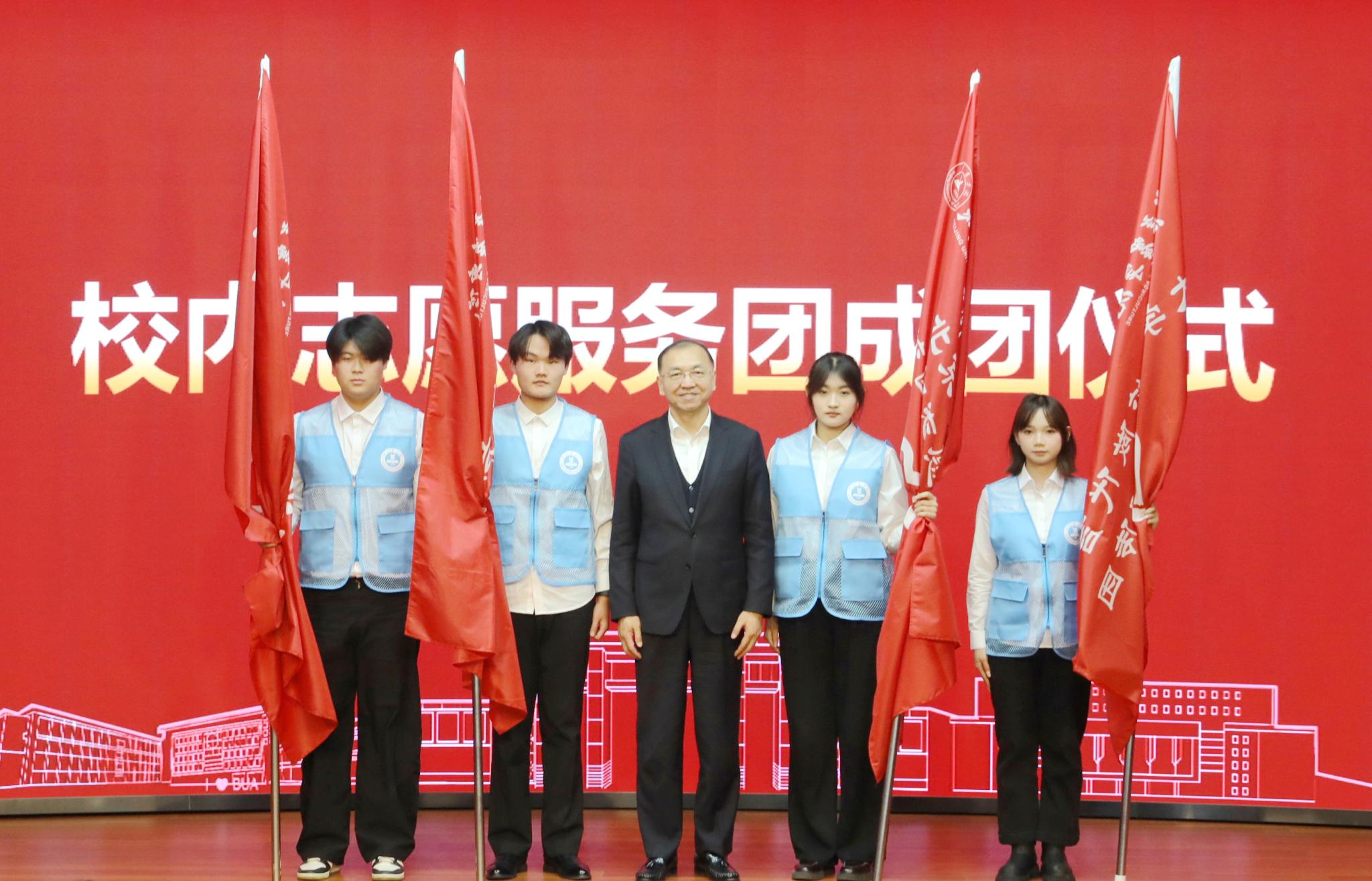 会议宣布成立了“我为母校做代言”大学生招生宣传团、“北农耕读”实践团、北京农学院勤禾志愿团、北京农学院平安校园志愿者行动队4支校内志愿服务团,仲丛生为志愿服务团授旗。