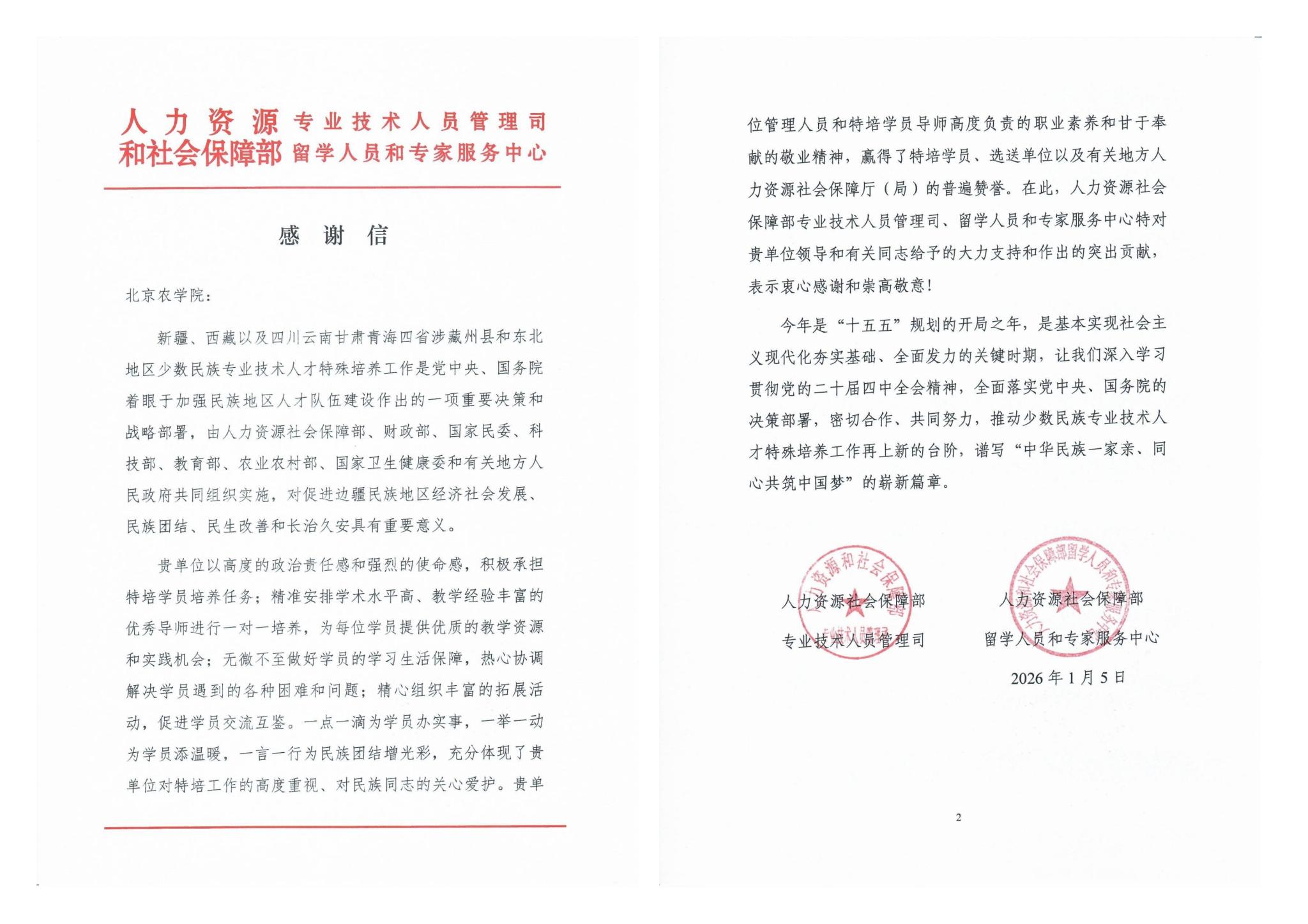 学校以高度的政治责任感和强烈的使命感,积极承担新疆、西藏以及四川云南甘肃青海四省涉藏州县和东北地区少数民族专业技术人才特殊培养工作,人力资源社会保障部专业技术人员管理司、留学人员和专家服务中心来信向我校工作人员表示感谢。