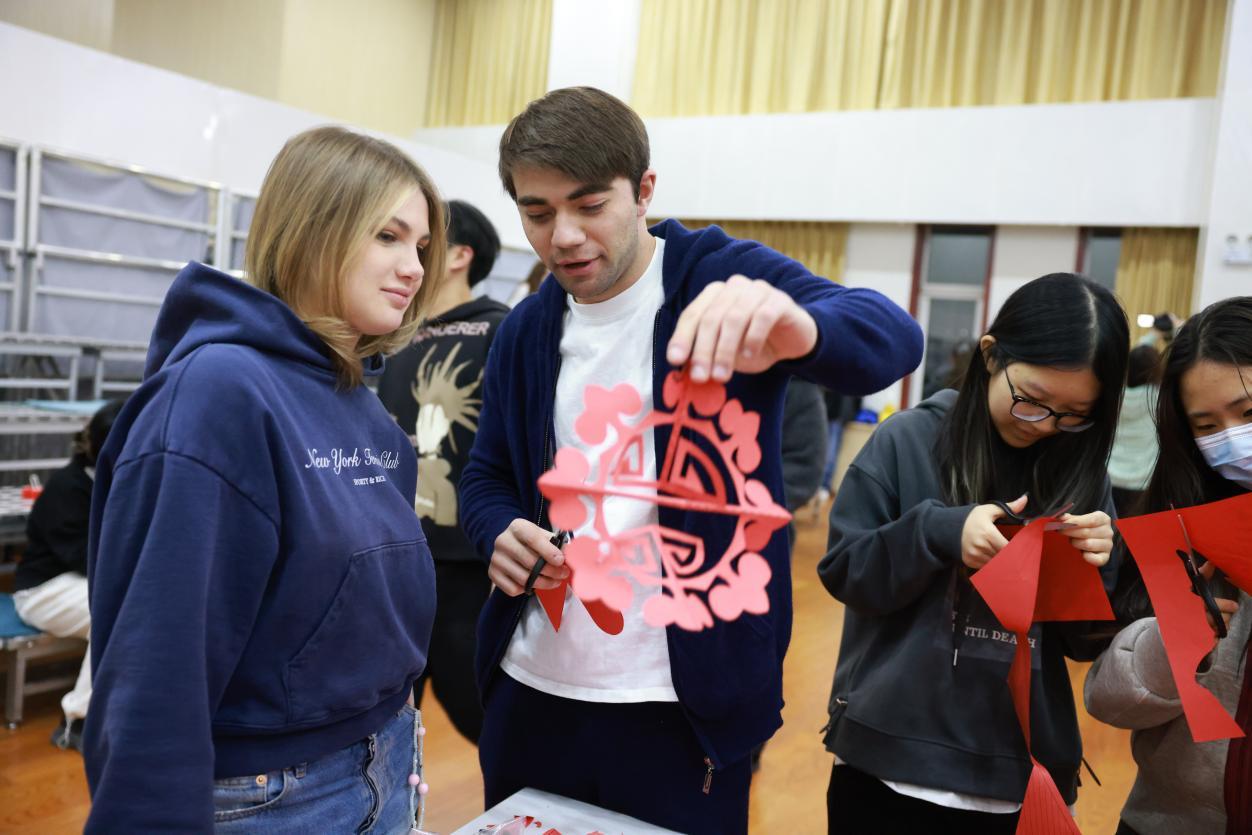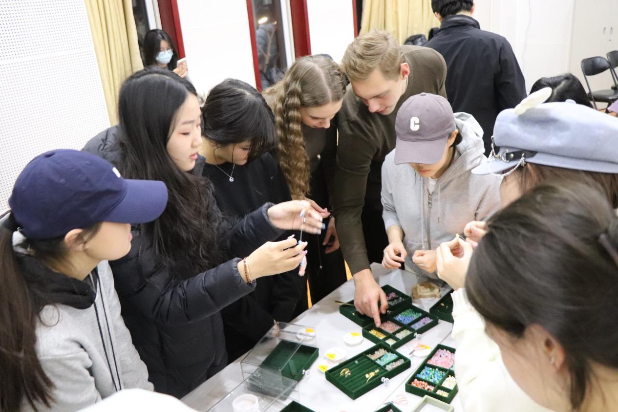 现场五大体验项目同步开启,共同构筑了一堂生动而深刻的“沉浸式文化课堂”。点翠体验区内,学子们手持仿翠羽材料,悉心粘贴于底胎之上,在一丝一缕间体味传统工艺的细腻与雅致;剪纸区域,红纸在指尖轻盈翻转,伴随着志愿者的耐心指导,“福”字与花鸟纹样渐次绽放,栩栩如生;串珠区则珠光流转,各国学子将缤纷彩珠一一串联,编织出既承古意又具个性的手链,也串起了跨越国界的情谊;投壶区不时传来阵阵欢呼,参与者凝神屏息,一投一掷间重现千年礼射之风;香囊区弥漫着清雅芬芳,艾草、丁香等天然香料被细心填入织囊,一针一线里缝入了温暖的冬日祝愿。在这场手与心相连的实践中,语言的隔阂悄然消融,文化的共鸣,正于指尖无声流淌。